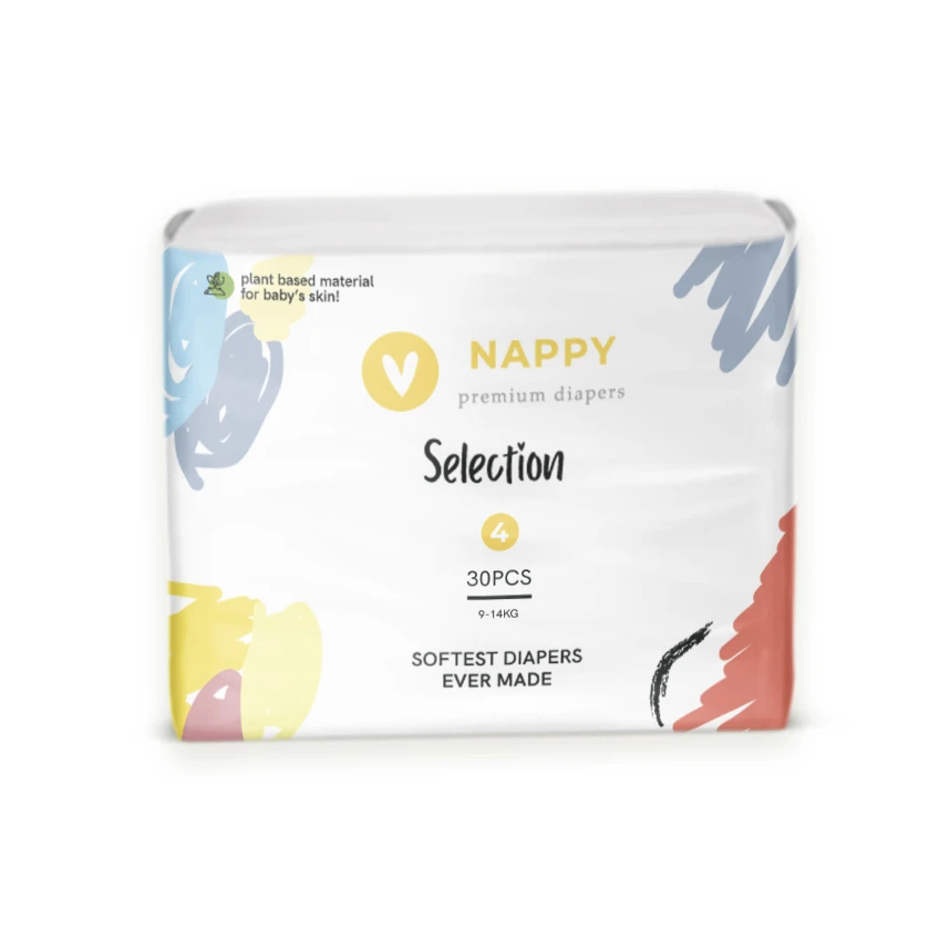 Nappy Selection is made with plant based sustainable material especially for your babies skin, our patented channels technology that allows up to 12 hours leak free protection, and easy movement has revolutionized the diaper performance, added to the specially developed softness to keep your babies skin dry and soft.