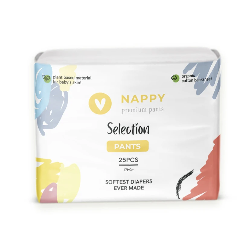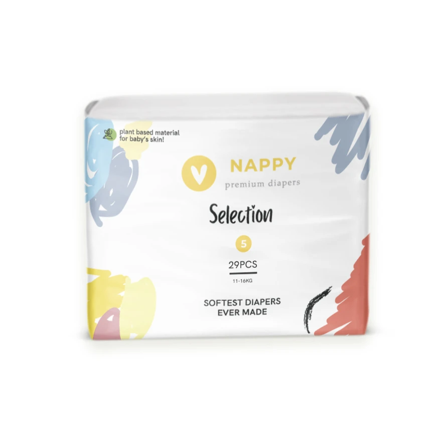 Nappy Selection is made with plant based sustainable material especially for your babies skin, our patented channels technology that allows up to 12 hours leak free protection, and easy movement has revolutionized the diaper performance, added to the specially developed softness to keep your babies skin dry and soft.